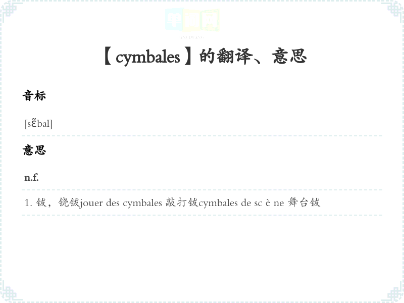 【cymbales】 助记:、 词根:、 联想、 名词化:、 词化:、 近义词、 反义词、 同音、近音词 联想词