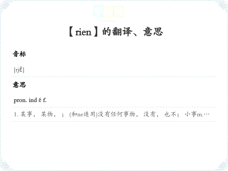 某事, 某物, ; (和ne连用)没有任何事物, 没有, 也不; 小事m.无, 乌有; 微不足道的事物;de~没有; 毫无价值的, 很小的pron.也没有, 也不形容词修饰rien, quelqu’un, quoi 等代词时前面要加de. eg : Quoi de neuf ?Parmi ces diapositives, j’en ai trouvé quelques-unes d’intéressantes. Rien d’autrepron. indéf.[要和后面以元音开始的词联诵, 如:~àdire [用于疑问句、否定句从句中, 或与含有怀疑、否定意义的词连用]东西, 事物:A-t-on jamais~vu de pareil?有谁曾经见过这样的事情呢?Je ne crois pas qu'il puisse~prouver. 我不相信他能提出证明。 On doute qu'il sache~de cela. 有人怀疑他对这件事未必知道情况。 incapable de~dire说不出rester là sans~dire呆在那儿啥也不讲Le médecin étudie le tempérament du malade avant de lui~prescrire. 医生给病人开药之前, 先要察看他的身体。[和ne连用; 有时为了强调, 用~du tout]1[用作宾语]没有东西, 没有事情:Je ne vois~dans ce brouillard. 在这样的大雾中, 我也看不见。 Il ne sait~. 他都不知道。 ne savoir~de~一无所知ne faire~不, 不工作ne~faire à qn没有做伤害某人的事Ça ne fait~. 这没有关系。 n'avoir~一无所有Qui ne risque~n'a~. <谚>不入虎穴, 焉得虎子。 n'avoir~contre qn对某人没有意见n'avoir~à craindre都不怕Je n'ai~dit que ce que je pense. 我只是说了我所想的。 ne servir à~毫无用处On n'y peut~. (对此)毫无办法。 Il n'y a~d'autre. 别的都没有。 n'avoir~de没有一点儿…的味儿, 没有一点…的特征; 一点不是…:Sa fille n'a~de lui. 他女儿一点也不像他。 Il n'y a~de commun entre ces deux points de vue. 在这两种观点之间没有任何共同之处。 Cela n'a~d'impossible. 这不是一点也不可能。 ne. . . pour~au monde绝对不, 无论如何不:Je ne ferai cela pour~au monde. 我绝对不这事儿。 Il n'en est~. 没有这回事。 不是这回事。 Comme si de~n'était. 若无其事。 就好像事也没有发生似的。 谚>2[用作主语]都不…, 也不…3[用作表语]没un~略为, 稍微en~丝毫, 一点
