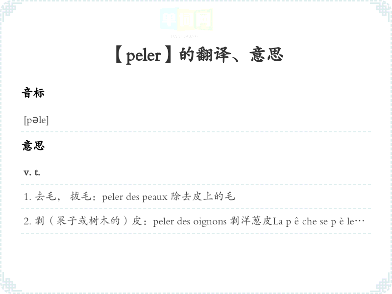 剥(果子或树木的)皮:peler des oignons 剥洋葱皮La pêche se pèle facilement. 桃子皮很容易剥。 peler un fruit (多于水果)éplucher les légumes (多于蔬菜)v. i.脱皮:dos qui pèle après un coup de soleil 因暴晒太阳而脱皮的背vt.1去毛, 拔毛 2剥(果子或树木的)皮vi.1脱皮 2~(de froid)<口>很冷口>
