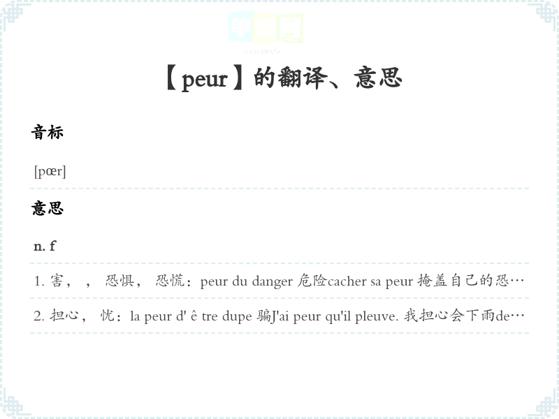 担心, 忧:la peur d'être dupe 骗J'ai peur qu'il pleuve. 我担心会下雨de / par peur de loc.prép. 由于害, 担心s'abstenir de manger de peur d'être étouffé 因噎废食de / par peur que loc.conj. 生, 恐, 担心[后接subj. ]Heureusement, plus de peur que de mal. 幸好,这只是虚一场。Ils parlent tout bas de peur qu'on ne les entende. 他们讲话声特别小,生别人听到了。