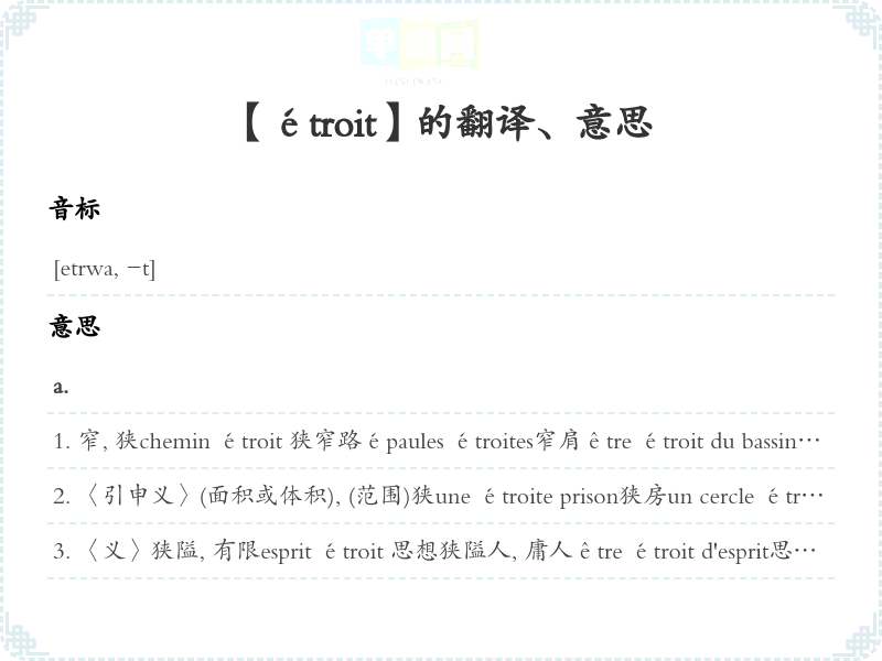 〈引申义〉(面积或体积), (范围)狭une étroite prison狭房un cercle étroit de relations〈转义〉狭交际圈子mot pris dans son sens étroit 〈转义〉作狭义解释词