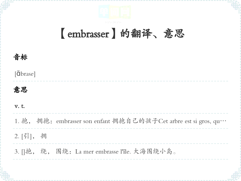 【embrasser】 联想:、 名词变化:、 近义词:、 反义词: 联想词