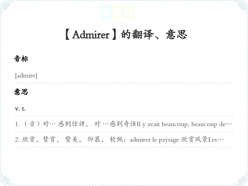 欣赏,赞赏, 赞美, 仰慕, 钦佩:admirer le paysage 欣赏风景Les visiteurs étrangers admirent beaucoup ces objets d'arts artisanaux. 外国来宾非常欣赏这些工艺品。
