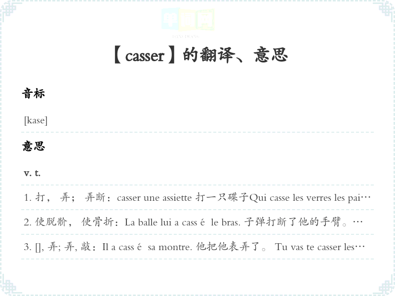 打, 弄; 弄断:casser une assiette 打一只碟子Qui casse les verres les paie. [谚]谁打破杯子谁赔。 谁惹祸谁收拾。 On ne fait pas d'omelettes sans casser des œufs. [谚]要有所得必有所失。 casser du bois (1)劈柴(2)[空](飞机)急降时受[转, ]: casser sa pipe 死casserole cou (la figure, la gueule) à qn 痛打某人, 打伤某人, 打死某人casser la tête 使头昏脑胀, 使厌烦, 使疲劳:Ce vin casse la tête. 这酒使人头昏。 Il nous casse la tête avec ses discours. 他的讲话使我们感到厌烦。 casser la croûte 小吃, 吃casser le morceau 坦白承认; 揭露真相casser du sucre sur le dos de qn 背后诽谤某人Ça ne casse rien. 这不足为奇。 这真是微不足道这。 à tout casser 飞快地; 非常的, 不寻常的; 至多:Il conduit sa voiture à tout casser. 他把车开得飞快。 une colère à tout casser 狂怒un film à tout casser . 一部不寻常的影片Ça demandera trois jours, à tout. casser 这最多需要三天时间。