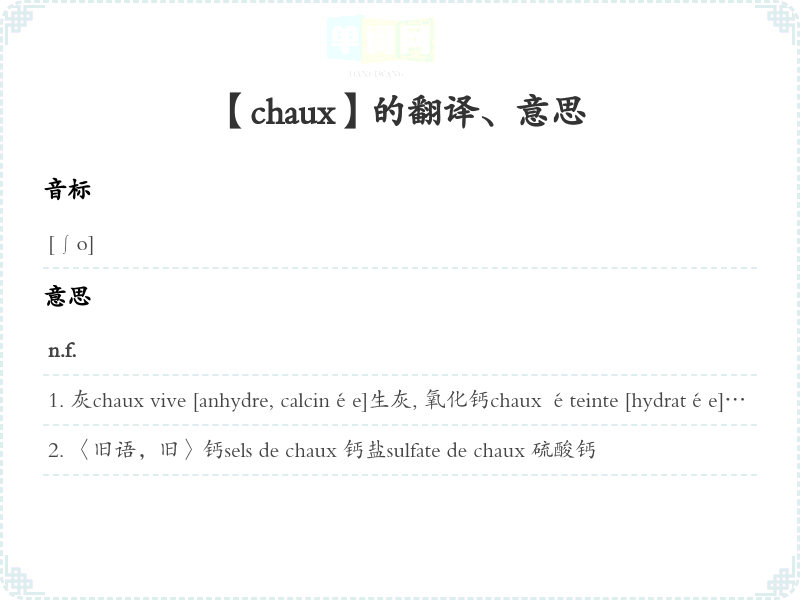 【chaux】 词源:、 词根:、 联想、 同音、音词 联想词