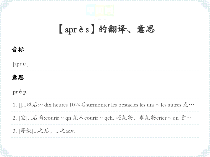 [空]后面,后面après prép. ~ que[主要动作之后] , …之后, …以后[从句动词直陈式]d'~ prép.根据; 按照, 模仿~coupadv.[短语]事后[短语]以后的~toutadv.[短语]总之, 毕竟ci-~adv.[短语]面, 后面