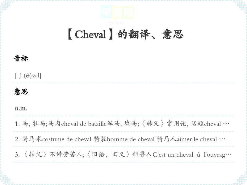 马, 牡马;马肉cheval de bataille军马, 战马;〈转义〉常用论, 话题cheval de labour耕马cheval pur sang纯种马cheval reproducteur种马cheval de selle乘用马cheval de somme役马cheval de trait挽马descendre de cheval 下马monter à cheval 上马monter sur un cheval 骑上一匹马monter un cheval à poil骑一匹光背马pousser son cheval à fond de train催马飞奔se tenir bien sur son cheval 稳坐在马上fièvre de cheval 高烧, 高热remède de cheval 重药changer [troquer] son cheval borgne contre un aveugle用独眼马换瞎马 [喻越换越坏]monter sur ses grands chevaux发脾气;摆出高傲样子Cela ne se trouve pas sous [dans] le pas d'un cheval .这不是唾手可得。avoir mangé du cheval 表现出异常精力la mort du petit cheval 事情告吹;希望落空C'est un cheval à l'écurie.这是一件让人经常花钱, 但又无用东西。