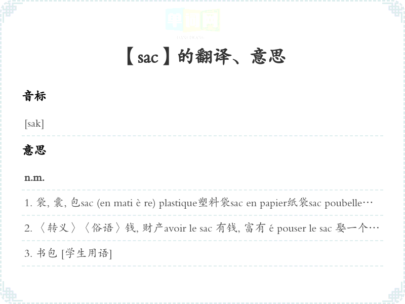 袋, 囊, 包sac (en matière) plastique塑料袋sac en papier纸袋sac poubelle垃圾袋sac à farine面粉袋sac de sable(供拳击手练拳用的)沙袋course en sac 套袋赛跑mettre en sac 装袋sac de voyage, 〈旧语,旧义〉 sac de nuit 旅行袋sac de couchage睡袋sac à ouvrage针线活计袋sac à dos背包Sac au dos!背上背包!sac (à main)女用手提包sac à malices魔术袋Sac à papier!〈旧语,旧义〉见鬼!être fagoté [ficelé] comme un sac 衣衫褴褛[用作appos.]paletot sac 宽腰身大衣robe sac 直统裙sac d'embrouilles, sac de nœuds〈语〉麻一团mettre dans le même sac 不分好歹, 混为一谈prendre qn la main dans le sac 将某人当场捉住L'affaire est dans le sac .事情已有十分把握。avoir plus d'un tour dans son sac 诡计多端sac à vin酒鬼, 醉汉homme [gens] de sac et de corde〈转义〉十恶不赦的坏人