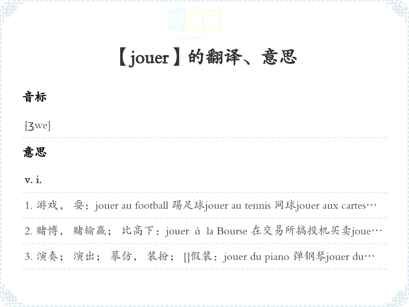 演奏; 演出; 摹仿, 装扮; []假装:jouer du piano 弹钢琴jouer du violon 拉小提琴Cet acteur a cessé de jouer. 这个演员已不再演出。 jouer au savant 冒充学者