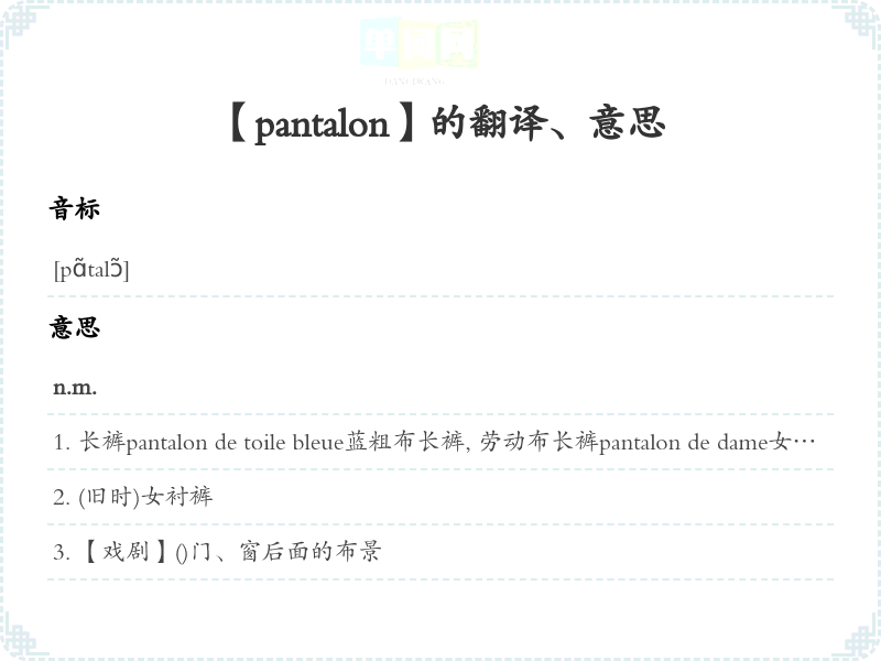 长裤pantalon de toile bleue蓝粗布长裤, 劳动布长裤pantalon de dame女式长裤pantalon à bas évasé [à pattes d'éléphant]喇叭裤pantalon de pyjama睡裤pantalon de ski [de golf]滑雪 [高尔夫球] 裤mettre [enfiler] son pantalon 长裤Elle est en pantalon .她着长裤。