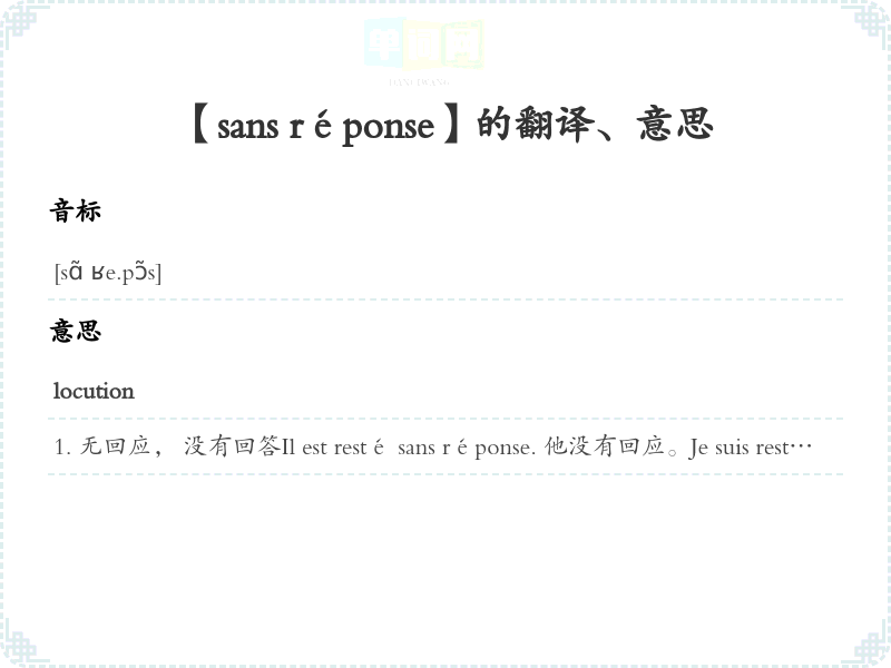 无回应, 没有回答Il est resté sans réponse. 他没有回应。Je suis resté sans réponse à sa question. 我对他的问题无言以对。Une lettre sans réponse. 一封没有回复的信。