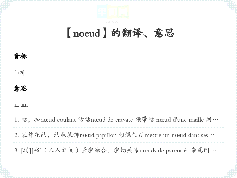 结,扣nœud coulant 活结nœud de cravate 领带结 nœud d'une maille 网(眼)扣 nœud simple / double 单/双结 faire / défaire un nœud 打/解结 nœud gordien [转]难题 couper / trancher le nœud gordien 斩钉截铁地解决难题,快刀斩乱麻 sac de nœuds [口]极其复杂、充满陷阱、困难事