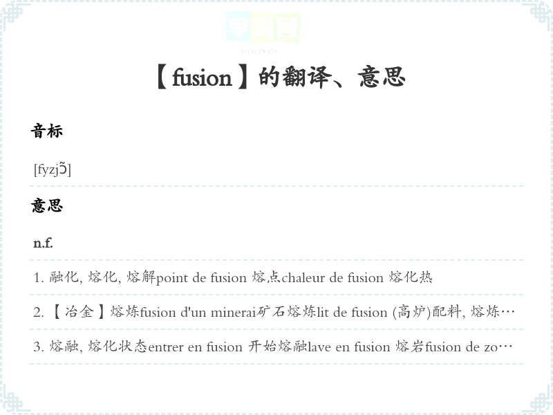 〈转义〉融合, 合, 联合fusion de deux sociétés两个公司合fusion entre l'homme et la nature人与自然融合fusion de deux fichiers【计算机】两个文件合
