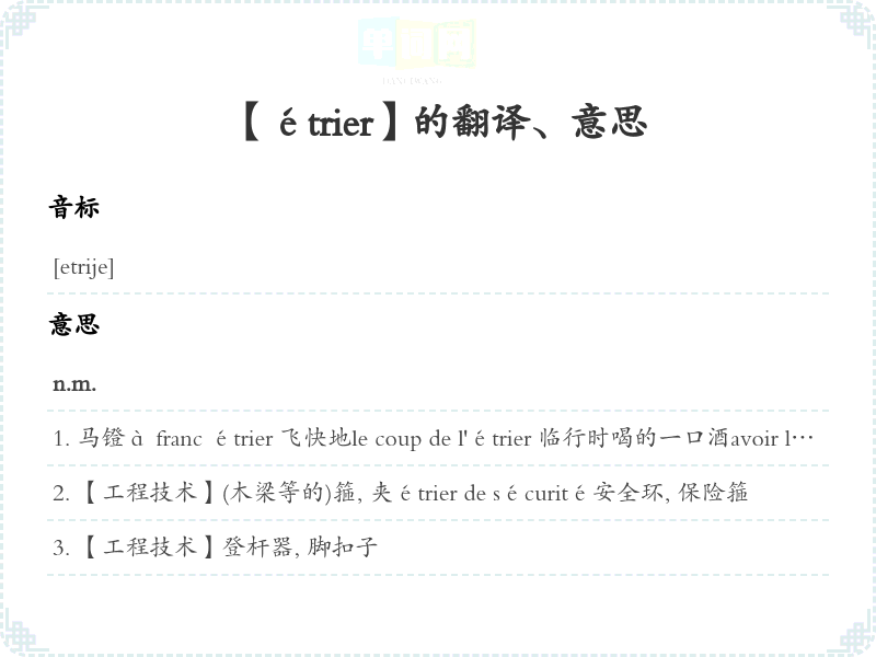 马镫à franc étrier 飞快地le coup de l'étrier 临行时喝的一口酒avoir le pied à l'étrier 即将启程;〈转义〉处境顺利, 成功望être ferme sur ses étriers马上坐得稳稳的;〈转义〉拿稳了主意mettre le pied à l'étrier à qn, tenir l'étrier à qn帮助上马;〈转义〉事业开始时助一臂之力perdre [vider] les étriers摔下马来;〈转义〉理屈词穷