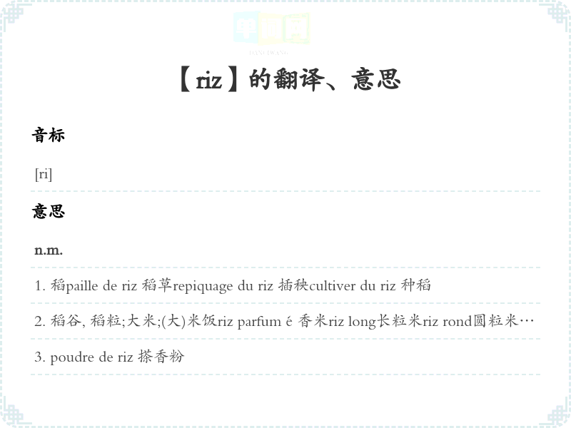 稻谷, 稻粒;大米;(大)米饭riz parfumé香米riz long长粒米riz rond圆粒米riz blanc [nature]白米饭riz cantonais广(东)式蛋炒饭eau-de-vie de riz 米酒riz au curry咖喱饭