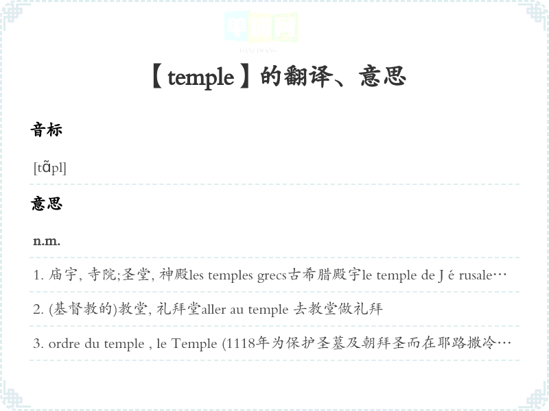 庙宇, 寺院;圣堂, 神殿les temples grecs古希腊殿宇le temple de Jérusalem [de Salomon], le Temple (古代犹太人在3个不同时期建立的)耶路撒冷古圣殿