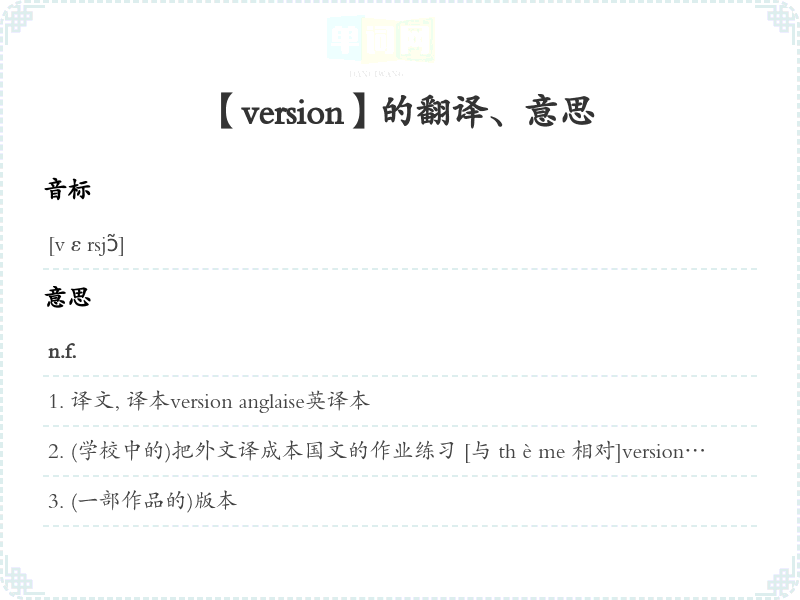 (学校中的)把外文译成本国文的作业练习 [与 thème 相对]version allemande把德文译成本国文的翻译练习faire une version 作外文译成本国文的练习