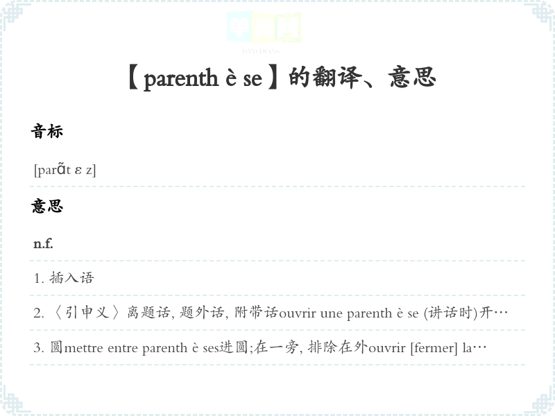 【parenthèse】 助记:、 词根:、 近义词: 联想词