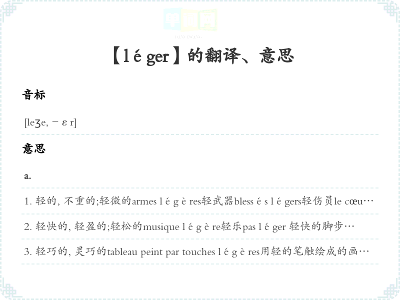 轻快的, 轻盈的;轻松的musique légère轻乐pas léger 轻快的脚步poésie légère轻快的诗rôle léger 要求有轻快自如的歌喉的角色taille légère轻盈的体voix légère轻快自如的歌喉danseuse légère comme un papillon蝴蝶般轻盈的舞女