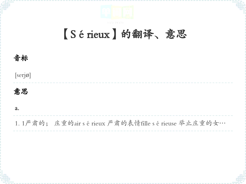 1严肃的; 庄重的air sérieux 严肃的表情fille sérieuse 举止庄重的女孩子2认真的; 当真的; 可靠的un élève sérieux 一个认真的学生argument sérieux 可靠的论据3重要的, 重大的; 严重的sérieux troubles de la vision 严重的视力障碍la situation est sérieuse 局势重大n. m.1严肃garder son sérieux 保持庄重2认真; 可靠; 重要性, 严重性il fait beaucoup de sérieux pour un débutant 他作为一名新手显得非常认真le sérieux de la situation 局势的严重性3[文]严肃剧种