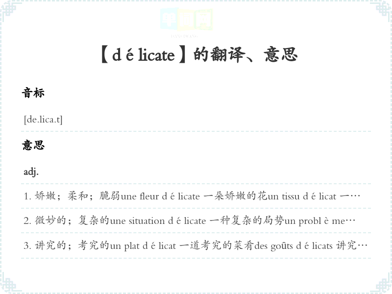 娇嫩;柔和;脆弱une fleur délicate 一朵娇嫩的花un tissu délicat 一种柔和的布料une voix délicate 一种脆弱的声音