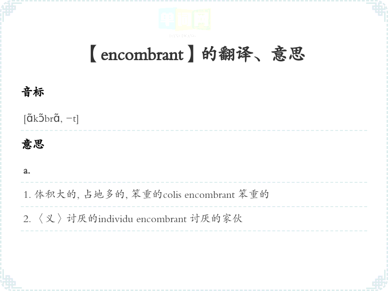体积大的, 占地多的, 笨重的colis encombrant 笨重的
