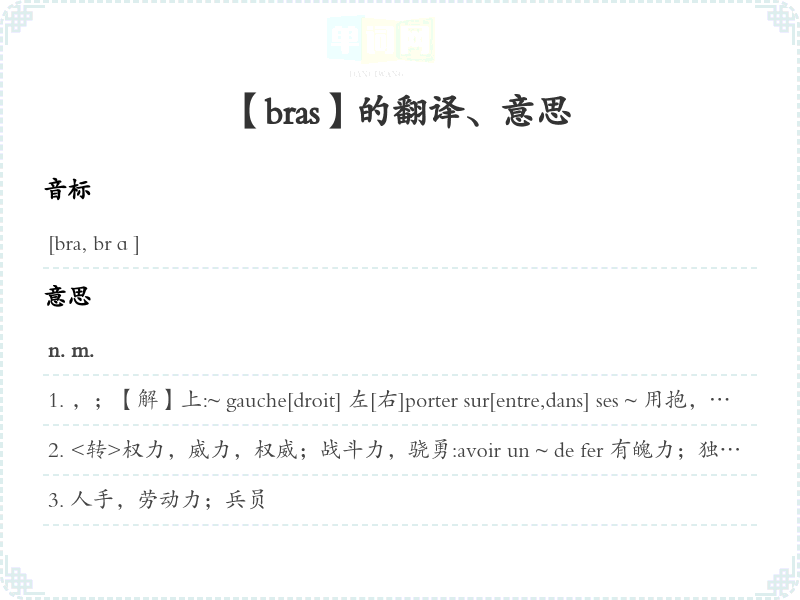,;【解】上:~ gauche[droit] 左[右]porter sur[entre,dans] ses ~ 用抱,里抱着porter [tenir] un objet sous le ~ 把一物夹在腋下ouvrir [tendre] les ~ 伸出双serrer qn dans ses ~ 紧抱某人tomber dans les ~ l'un de l'autre 相互拥抱donner [offrir] le ~ à qn 伸出双让某人靠着行走prendre le ~ de qn 挽着某人的手son panier au ~ 手上挽着篮子brandir à bout de ~ 伸直手使劲挥动<转>traiter qn de monsieur le directeur gros comme le ~ 一再地奉承某人为"主任先生"couper ~ et jambes à qn 使某人筋疲力尽;使某人惊得发呆Les ~ m'en tombent. 我惊得呆若木鸡。ne vivre que de ses ~ 靠体力劳动过活se croiser les ~, rester les ~ croisés 无所事事;袖手旁观avoir le ~ long 有威信,有影响avoir les ~ rompus 累得像断了似的,累得筋疲力尽tendre [ouvrir] les ~ à qn 援助某人;原谅某人tendre les ~ vers qn 向某人求援se jeter dans les ~ de 投入...的抱转>