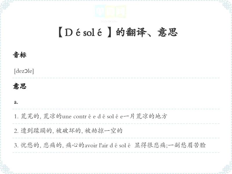 忧愁的, 悲痛的, 痛心的avoir l'air désolé 显得很悲痛;一副愁眉苦脸