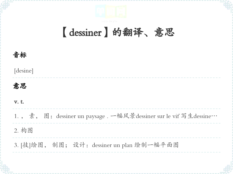 , 素, 图:dessiner un paysage . 一幅风景dessiner sur le vif 写生dessiner d'après nature 照实物素dessiner au crayon (à la plume) 笔(钢笔), 用笔(钢笔)素l'art de dessiner 绘艺术