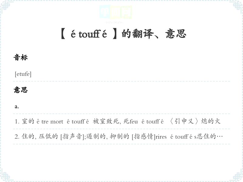 窒的être mort étouffé 被窒致死, 死feu étouffé 〈引申义〉熄的火
