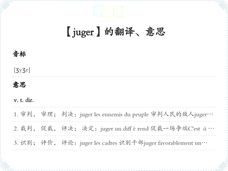 审判, 审理; 判决:juger les ennemis du peuple 审判人民的敌人juger un procès 审理一件诉讼案[宾语省略]Le tribunal jugera. 法庭将进行审理。