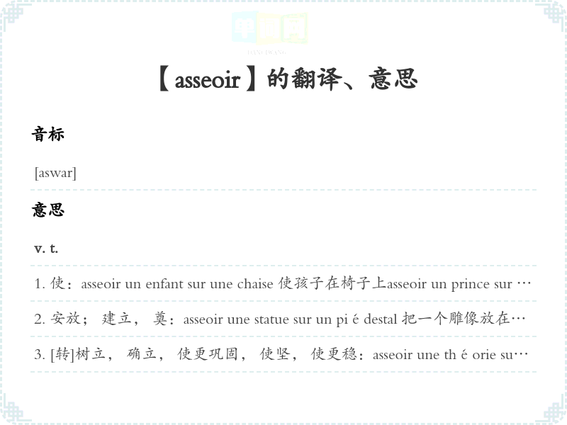 【asseoir】 助记:、 词根:、 派生:、 近义词:、 反义词: 联想词