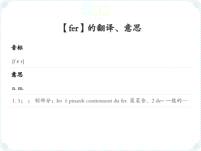 1; ; 制部分;les épinards contiennent du fer. 菠菜含。2 de~ 一般的, 钢般的, 结实的, 有力的, 坚定的, 坚硬的, 固执的3具, 武等的制或金属部分4制具fer à repasser 熨斗fer à friser 烫发钳5钢筋, 型钢; 型材fer en U 槽6剑, 花式剑7 pl. <旧>产钳8鱼钩9蹄un fer à cheval 马蹄10 pl. 镣铐, 锁链; <书>奴隶, 被奴役书>旧>