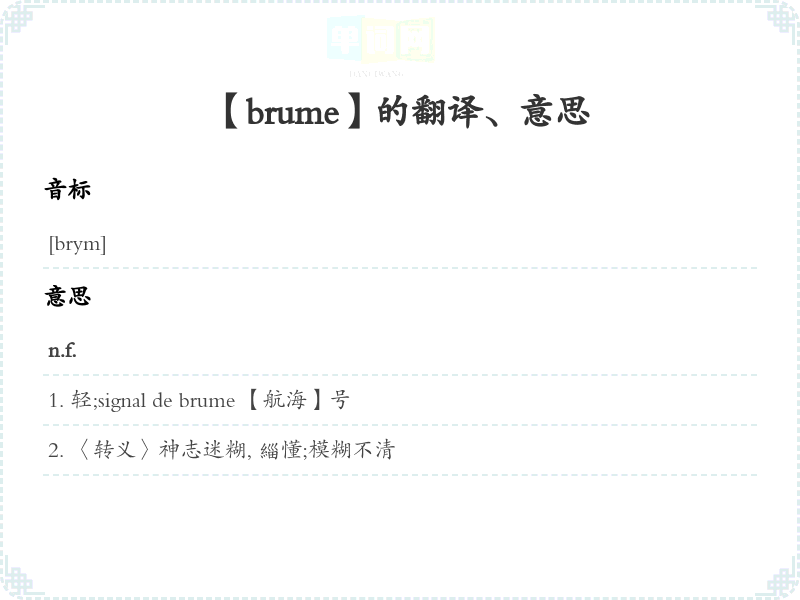 【brume】 词源:、 联想:、 近义词:、 反义词: 联想词