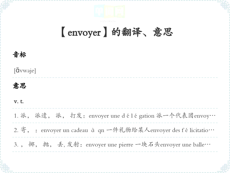 派, 派遣, 派, 打发:envoyer une délégation 派一个代表团envoyer un enfant à l'école 把孩子到学校去envoyer qn à qn 派某人去看某人envoyer promener (paître, coucher) qn [转, 俗]撵走某人envoyer qn dans l'autre monde 某人上西天envoyer une personne en mission 派某人去办事Envoyez-la prendre de leurs nouvelles. 派她去打听他们的消息。 [宾语省略]J'ai envoyé chercher un médecin. 我已经派人去找医生。 Il ne le lui a pas envoyé dire. 他直截了当地当面和他谈了。