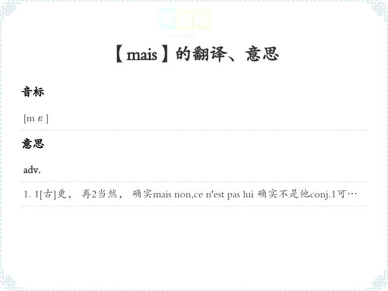 1[古]更, 再2当然, 确实mais non,ce n'est pas lui 确实不是他conj.1可是, 但是, 然而2而是, 倒是3[承上接下]:M ~ revenons a notre sujet.我们言归正传吧M~qu'ai-je dit?我究竟讲了什么呀?4[在某些惊叹句或疑问句中, 表示惊讶、怀疑等]5 non seulement. . . , ~[~encore, ~aussi, ~même, ~en outre]. . . 不仅…, 而…6强调回答或感叹 (与感叹词等连用):Eh~!啊呀!