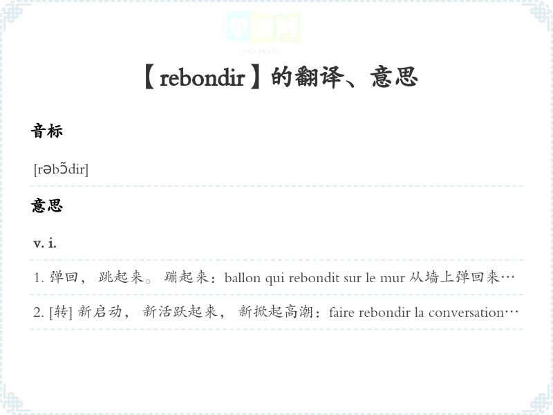 弹回, 跳起来。 蹦起来:ballon qui rebondit sur le mur 从墙上弹回来的球