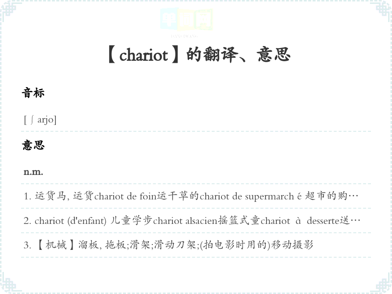 【chariot】 助记:、 词根:、 近义词: 联想词