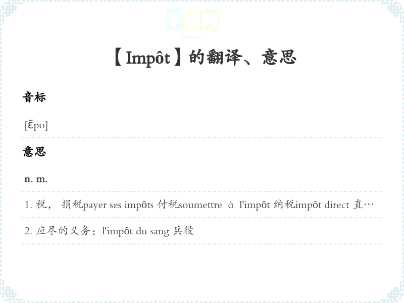 税, 捐税payer ses impôts 付税soumettre à l'impôt 纳税impôt direct 直接税impôt indirect 间接税impôt sur le revenu 所得税la perception des impôts 征税