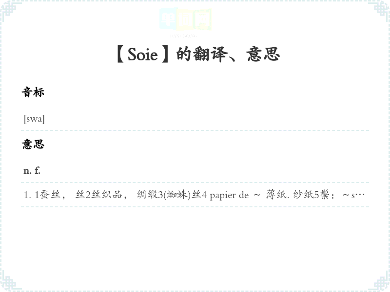 1蚕丝, 丝2丝织品, 绸缎3(蜘蛛)丝4 papier de ~ 薄纸. 纱纸5鬃:~s du porc 猪鬃6[兽医](猪颈部)先天瘘7[技](锉、剑)尾, 柄舌