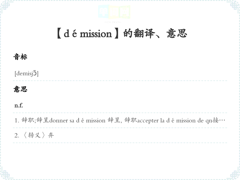 【démission】 词根:、 近义词:、 反义词: 联想词