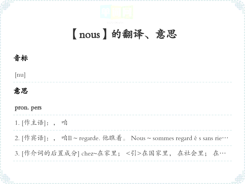 [代替其他人称代词]:代替第一人称单数, 刊前言或演说中, 表示谦虚; 或行政机关发布的命令或公函中。 有关形容词等仍单数; 代替第二或第三人称单数, 表示讽刺或亲热, 有关形容词单数, 代替第二人称复数时, 形容词仍复数; 律师、公证人在代表当事人说话时nous代替第三人称单数。