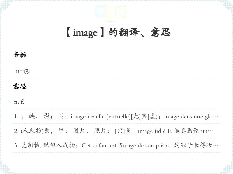 (人或物)画, 雕; 图片, 照片; [宗]圣:image fidèle 逼真画像;un chasseur d'images 新闻片摄影师; 猎奇摄影记者