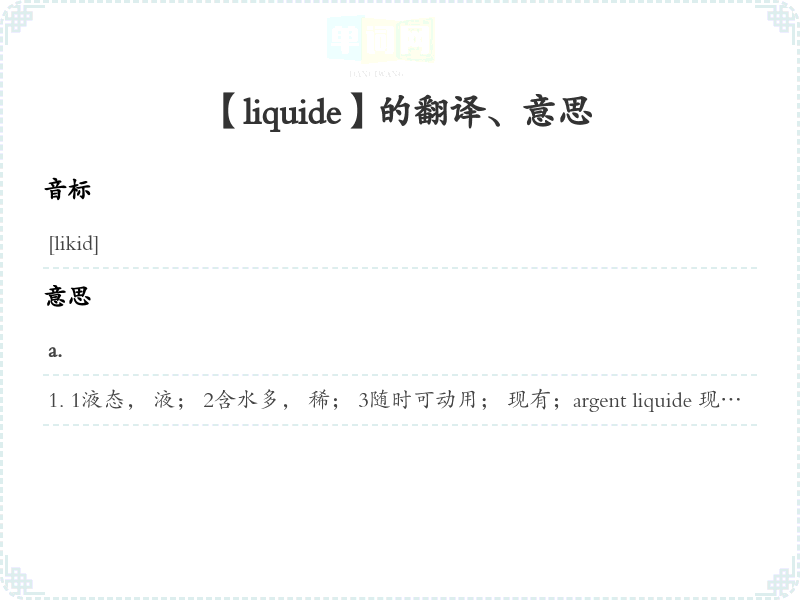 1液态, 液; 2含水多, 稀; 3随时可动用; 现有;argent liquide 现金,随时可动用现金4流音5确定(指债务, 债权); 净(指收入, 利润)m.液; 流质食物; 饮类, 酒类; 液f.流音
