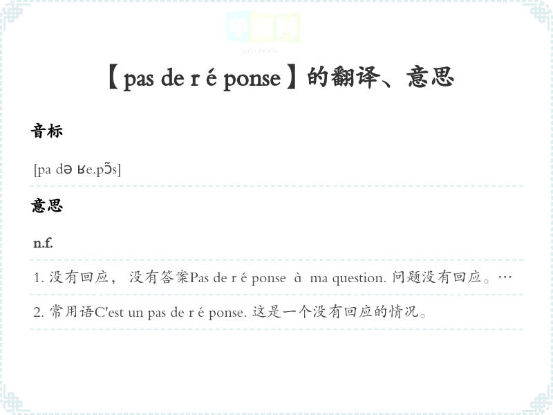 没有回应, 没有答案Pas de réponse à ma question. 问题没有回应。Pas de réponse de sa part. 他没有回应。