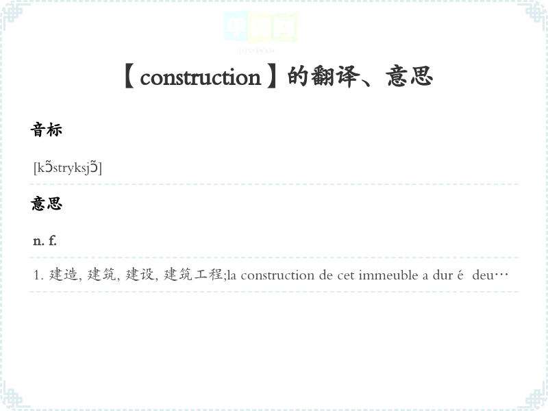 建造, 建筑, 建设, 建筑工程;la construction de cet immeuble a duré deux ans. 这栋大楼的建造为时两年。结构, 构造;Ces deux machines présentent une construction différente. 这两部机器构造不同。 建筑物;les nouvelles constructions nous cachent la vue de la mer. 这些新的建筑物挡住了我们的视线,看不见大海了。制造业, 制造; (句法、词法的)结构