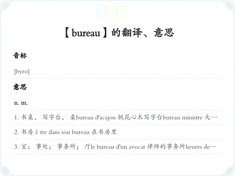 室; 事处; 事务所; 厅le bureau d'un avocat 律师的事务所heures de bureau 时间aller au/ à son bureau 去