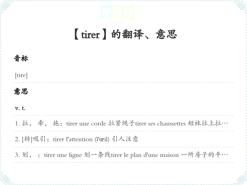 拉, 牵, 拖:tirer une corde 拉紧绳子tirer ses chaussettes 短袜往上拉拉挺tirer les oreilles à qn 拉人的耳朵se faire tirer l'oreille [转]让人再三请求, 不轻易同意tirer ses chausses (ses grègues) [转]逃跑tirer la sonnette d'alarme 拉响报警铃tirer le fils des marionnettes 拉木偶的线tirer les cordes (les ficelles) [转]暗中操纵, 幕后策划tirer qch en longueur 事拖得很久tirer du métal en fils 金属拉成丝tirer qn par le bras 拉人的胳膊tirer un tiroir 拉开抽屉tirer un rideau 拉帘子[拉开或拉上]tirer l'échelle 挪开梯子[使不再靠墙]Après celui-là, il faut tirer l'échelle. [转]再没有比他更行的了。 tirer une porte dernière (après) soi门随手拉上tirer l'aiguille [引]做针线活儿tirer la couverture à soi 独占好处; 最大的一份占为已有tirer un texte à soi 一篇文章作有利于自己的解释cheval qui tire une voiture 拉车的马tirer la jambe (由于疲乏原因)拖着腿走路