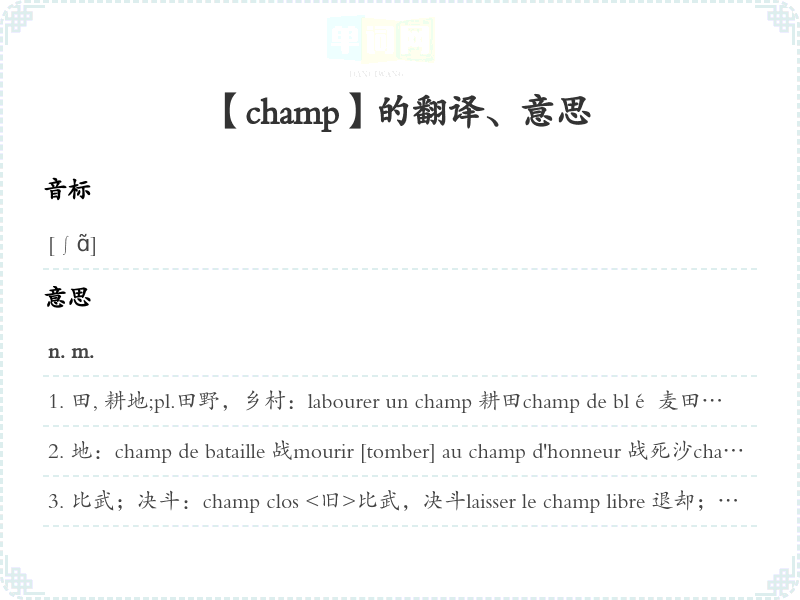田, 耕地;pl.田野,乡村:labourer un champ 耕田champ de blé 麦田champ d'expérimentation 试验田champ en terrasses 梯田la vie des champs 梯田la vie des champs 乡间生活les travaux des champs 农活fleurs des champs 野花à travers champs 穿过田野en plein(s) champ(s) 在野外prendre la clef des champs 溜走donner la clef des champs à qn 放走某人Champs-Élysées 香榭丽舍大道[巴黎一林荫道名]
