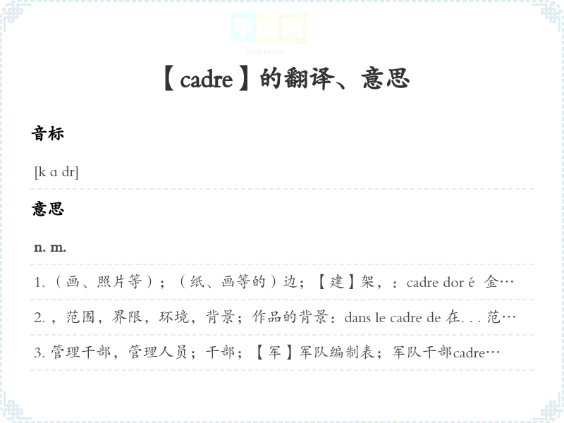 【cadre】 动词变化:、 近义词:、 反义词: 联想词